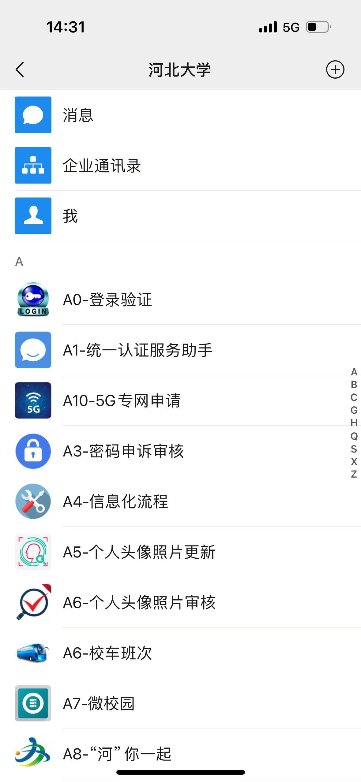 2. 成功加入企業微信的用戶在微信中可使用小程序功能,訪問相應授權的小程序(通訊錄-我的企業中可找到“河北大學”);
