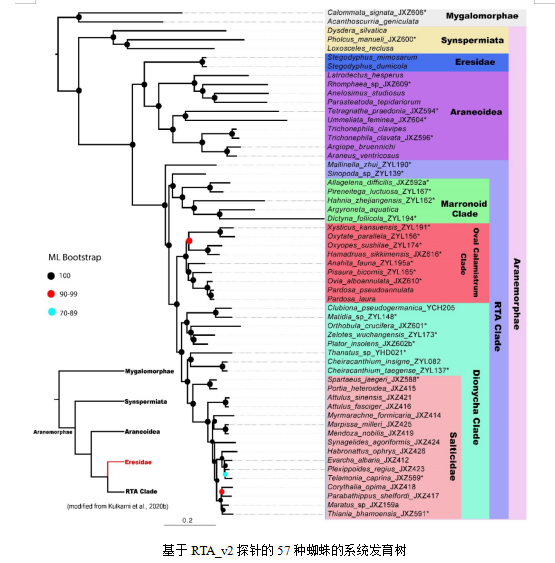 蜘蛛為陸地上多樣性最豐富的捕食性類群之一,是織網、性選擇和適應性進化研究的重要模型。RTA(脛節外側突)分支作為蜘蛛中的主要類群之一,其物種多樣性占蜘蛛的一半以上,是深入探究蜘蛛進化和多樣性的關鍵。為了更好地解析RTA分支復雜的系統演化關系,該項研究對15種RTA蜘蛛進行了全基因組測序,并利用8個參考基因組專門針對這一類群設計了UCE探針(RTA探針)用于系統發育基因組學研究。對所設計的探針進行了電腦模擬以及實驗室捕獲雙項測試,結果表明RTA探針的捕獲效率最高可達82%,其捕獲的位點數(~2597個UCEs)是蜘蛛目探針的2.5倍左右。利用RTA探針從57個物種獲得UCE數據并構建蜘蛛目和RTA分支主要譜系的系統演化關系,結果與其它系統發育基因組學研究結果基本一致。因此,該套探針的發表將進一步推動重建RTA分支以及蜘蛛目生命之樹的研究進程。