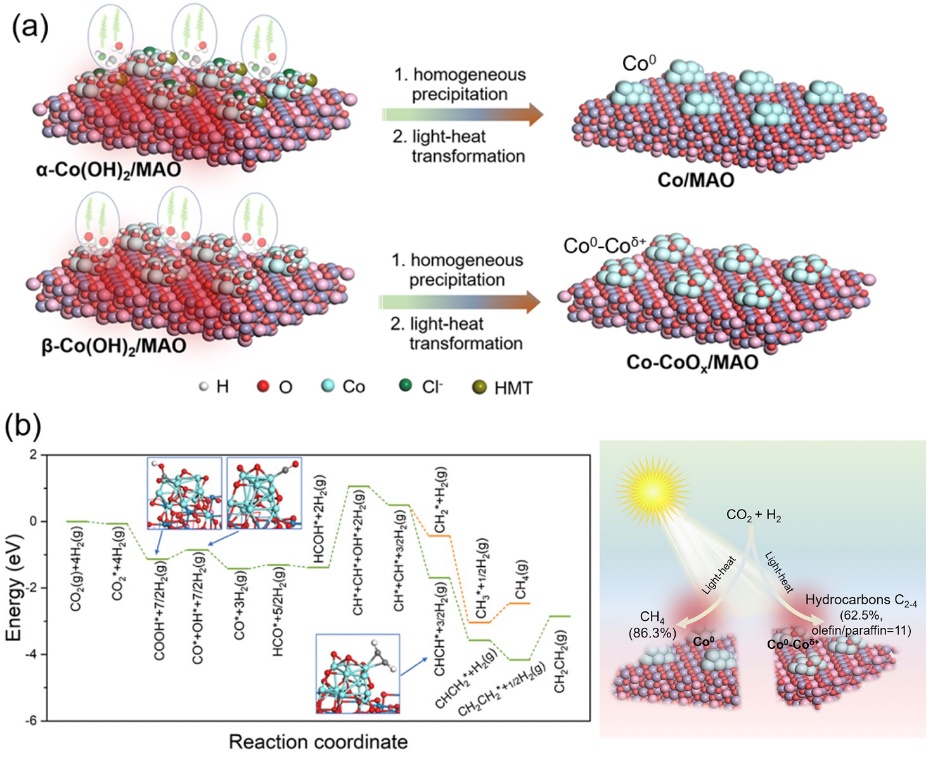 通過光熱催化二氧化碳(CO2)加氫將CO2轉(zhuǎn)化為多碳(C2+)產(chǎn)物是緩解能源短缺和實現(xiàn)碳中和的一種有效的方法。該反應(yīng)的瓶頸在于如何調(diào)控C1中間體的C-C偶聯(lián)反應(yīng)。本工作通過原位光熱活化構(gòu)筑Co0-Coδ+活性結(jié)構(gòu),作為C1中間體的C-C耦合協(xié)同催化活性位點。實驗和理論計算結(jié)果證實了界面雙活性位點實現(xiàn)有效吸附、活化CO2,通過Co0位點生成C1中間體,而引入Coδ+的缺電子態(tài)能有效降低關(guān)鍵CHCH*中間體的能壘。該研究提供了一種新的思路設(shè)計應(yīng)用于光還原CO2轉(zhuǎn)化為C2+碳?xì)浠衔锏墓鉄岽呋瘎?/p>