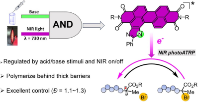 近紅外光誘導聚合具有條件溫和、高穿透性的特點,在大規模制備聚合物和生物領域具有獨特優勢,但近紅外光低的光子能量也限制了光催化劑的激發態活性,開發有效的近紅外光催化劑仍具有挑戰性。團隊基于前期研究基礎(Macromolecules, 2021, 54, 10, 4633–4640,Macromolecules, 2023, 56, 11, 4181–4189),提出了一種新的近紅外光催化劑。咪唑并苝酰亞胺分子中的咪唑基團在弱堿性環境中可以脫去質子,從而形成了具有近紅外光吸收和強的激發態還原能力的咪唑陰離子并苝酰亞胺。基于這類光催化劑實現了近紅外光誘導原子轉移自由基聚合,且具有以下特點:(1)具備活性聚合特征,所得聚合物分子量窄;(2)近紅外光穿透皮膚組織等障礙物后仍能聚合;(3)通過弱酸弱堿刺激和近紅外光開關兩種方式控制聚合的“開關”。