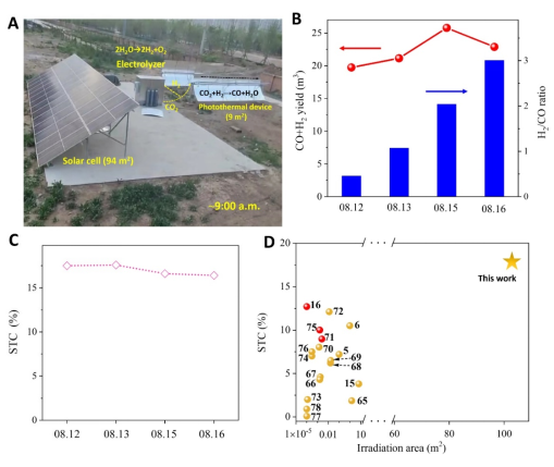 本工作中,李亞光課題組合成了Ag單原子負載NiO納米片(2D Ni1Ag0.02O1),原位DRIFTS和理論計算表明,CO2在2D Ni1Ag0.02O1的不對稱吸附增強了CO2的活化能力,這使得2D Ni1Ag0.02O1催化劑在室外低密度太陽光輻照下展現出高效的光熱逆水煤氣反應,在標準太陽光輻照下,其CO產率達到1065 mmol g-1 h-1。基于2D Ni1Ag0.02O1催化劑輔助的光熱CO2加氫系統和商用的光伏電解水制氫系統,李亞光課題組與孟慶波課題組聯合研制了光照面積達到103平方米的人工光合作用系統示范。該示范能夠擺脫電網依賴,實現全離網運行;在自然太陽光輻照下,能夠將CO2和H2O轉換為綠色合成氣,其產量達到~22m3/天,H2/CO比可以調整為0.4-3,平均太陽能-化學能轉換效率為17.0%。這項工作顯示了光伏-光熱耦合技術在人工光合作用領域的應用潛力,為光驅動碳中和領域的深度開發提供了一條可行的路徑。
