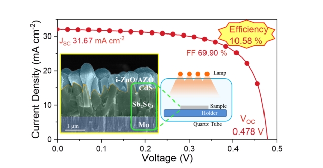 硒化銻(Sb2Se3)因其獨特且卓越的光電性能,在新型光伏器件前沿科技展現(xiàn)出巨大的應(yīng)用潛力。然而,異質(zhì)結(jié)界面及吸收層內(nèi)存在的載流子復(fù)合問題制約著硒化銻太陽能電池光電轉(zhuǎn)換效率的進一步提升。近日,該團隊提出了一種光退火處理技術(shù),實現(xiàn)了Sb2Se3/CdS異質(zhì)結(jié)界面的有效調(diào)控及器件光電轉(zhuǎn)換效率的提升。應(yīng)用光退火處理技術(shù),能夠促進異質(zhì)結(jié)界面附近的元素擴散及界面原子重新排列,同時能夠促進緩沖層中的鎘(Cd)元素向Sb2Se3吸收層內(nèi)部的擴散,這一過程有效地減少了異質(zhì)結(jié)界面處的界面缺陷和硒化銻深能級體缺陷,顯著提升Sb2Se3/CdS異質(zhì)結(jié)的質(zhì)量。制備的Sb2Se3/CdS異質(zhì)結(jié)太陽能電池獲得10.58%的光電轉(zhuǎn)換效率(認證效率10.18%),是目前已報導(dǎo)的硒化銻太陽電池的世界記錄。這項研究不僅展示了光退火處理在提升硒化銻太陽電池缺陷鈍化方面的巨大潛力,還為光伏領(lǐng)域的研究人員提供了全新的研究思路。