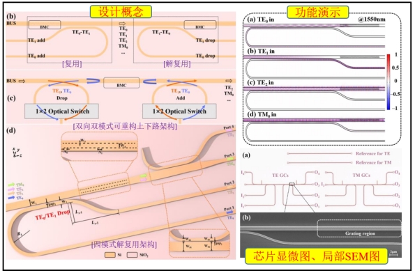 在模式復用技術方面,團隊提出一種基于反向模式變換多模波導光柵作為引擎,雙向非對稱定向耦合器作為接入波導的緊湊型片上模分復用架構。該架構克服了傳統技術不能直接訪問多模總線波導中的特定低階模式的局限,且可與光開關結合構建一種雙向/雙模式可重構模式上下路器,具有高度的靈活性和可擴展性。實驗演示了基于該架構的4通道模式解復用器具有0.3-2.4dB插損,低于-17.5dB模式串擾,3dB工作帶寬超100nm,性能達到同類先進水平。相關成果發表在IEEE/OSA Journal of Lightwave Technology(DOI 10.1109/JLT.2024.3499336), 碩士研究生張磊為第一作者,吳勝保副教授為通訊作者。
