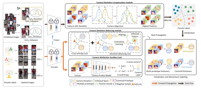 研究團(tuán)隊(duì)長(zhǎng)期致力于無(wú)監(jiān)督行人重識(shí)別領(lǐng)域的標(biāo)簽生成與優(yōu)化問(wèn)題的深入研究。無(wú)監(jiān)督行人重識(shí)別的核心目標(biāo)是從不同攝像頭捕獲的影像中準(zhǔn)確識(shí)別出同一行人。然而,由于攝像頭間的屬性和拍攝環(huán)境的差異,往往會(huì)導(dǎo)致顯著的域偏差問(wèn)題。因此,本文提出了基于攝像頭偏差消除學(xué)習(xí)的無(wú)監(jiān)督行人重識(shí)別方法(CDE-Learning),通過(guò)設(shè)計(jì)攝像頭偏差補(bǔ)償(CDC)模塊,有效對(duì)齊不同攝像頭拍攝得到的行人圖像的數(shù)據(jù)分布,在聚類階段減少類內(nèi)偏差,優(yōu)化偽標(biāo)簽質(zhì)量;攝像頭偏差平衡(CDB)模塊將對(duì)不同攝像頭下行人圖像的約束條件整合到統(tǒng)一損失函數(shù)中,自適應(yīng)構(gòu)建圖像對(duì)比對(duì),避免復(fù)雜參數(shù)調(diào)整,提升模型適應(yīng)性;攝像頭屬性輔助(CAA)任務(wù)則進(jìn)一步增強(qiáng)模型對(duì)背景的理解,隱式提升區(qū)分?jǐn)z像頭間圖像偏差的能力。