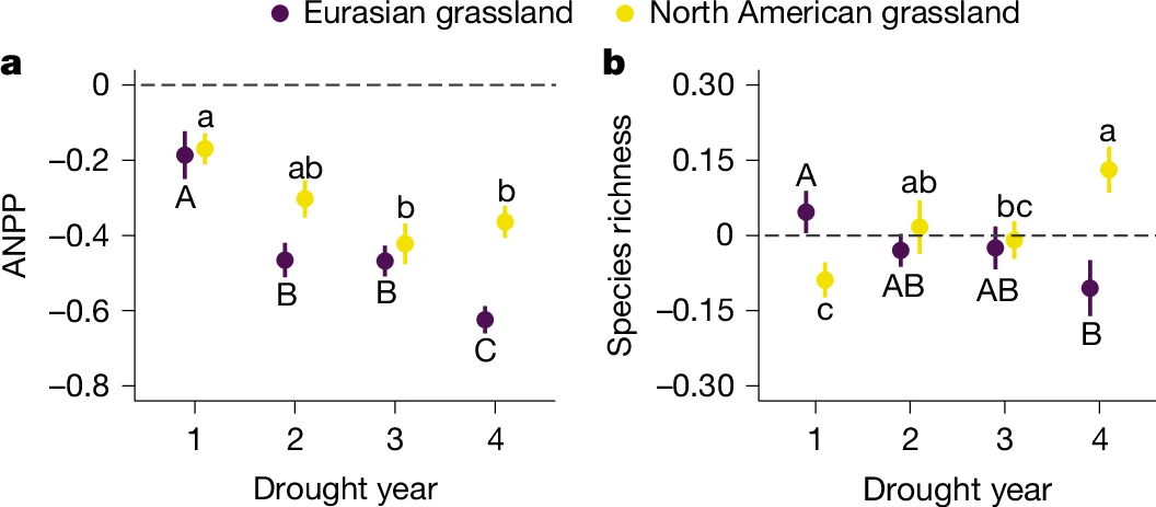 極端干旱通常會降低草原生態系統的生產力,進而削弱自然生態系統的服務功能。然而,不同類型的草原在經歷多年極端干早時,這種負面影響會有多大差異,以及這種差異隨時間如何變化尚不清楚。該研究通過2013年設置的中美草原生態系統極端干旱聯網實驗(圖1),模擬了連續四年生長季干旱(降雨量減少約66%),比較了歐亞草原和北美草原各6個具有代表性的草原生態系統的干旱敏感性。發現在歐亞草原,干旱導致植物地上生產力大幅下降,下降的程度隨著干旱年限而增加,表現為累積效應;而在北美草原,植物地上生產力的下降幅度較小,下降的程度隨著干旱年限沒有顯著增加,表現為適應效應(圖2)。干旱對物種豐富度的影響在歐亞草原從增加轉變為降低,但在北美草原則從降低轉變為增加,這些不同的變化是由非優勢物種的變化驅動的。物種豐富度尤其是非優勢物種的豐富度相反的變化,導致歐亞和北美草原具有截然不同的干旱敏感性。該研究結果表明,歐亞草原對極端干旱的敏感性高于北美草原,而非優勢物種在決定極端干旱對草原生產力的影響方面發揮了關鍵作用。