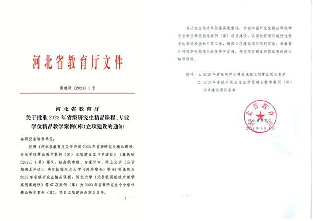 近日,河北省教育廳下發《河北省教育廳關于批準2023年省級研究生精品課程、專業學位精品教學案例()立項建設的通知》(冀教研〔20235號),批準河北大學《網絡安全》等5項課程為2023年省級研究生精品課程河北大學《無損檢測新技術教學案例庫建設》等5項案例()2023年省級研究生專業學位精品教學案例()